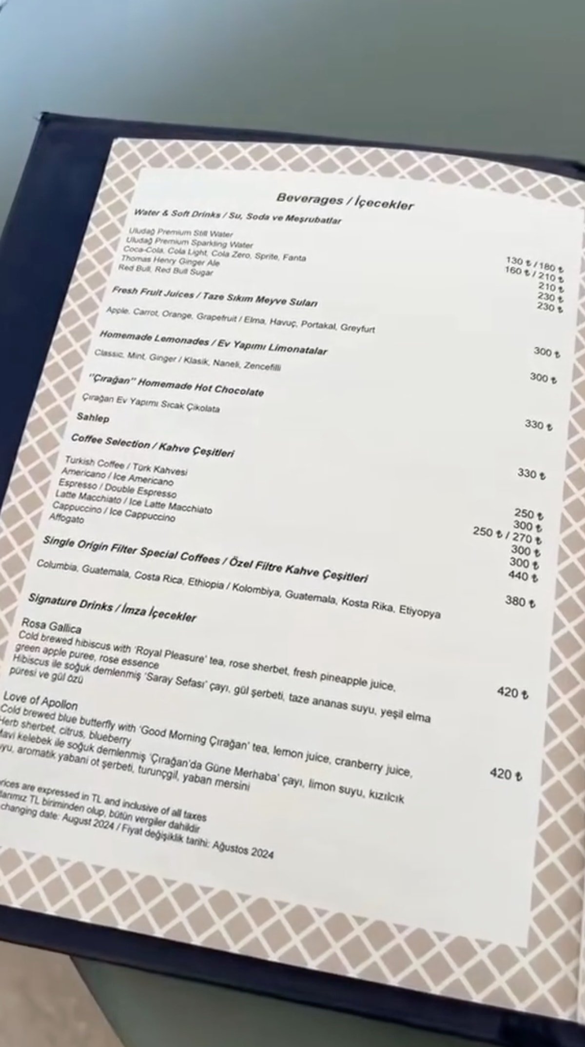 Instagram’da Yağmur Demirci tarafından paylaşılan menüde, Çırağan Sarayı’nda bir Türk kahvesinin fiyatının 250 TL olduğu, espressonun 250 liradan, sahlepin ise 330 liradan satılması dikkat çekti.