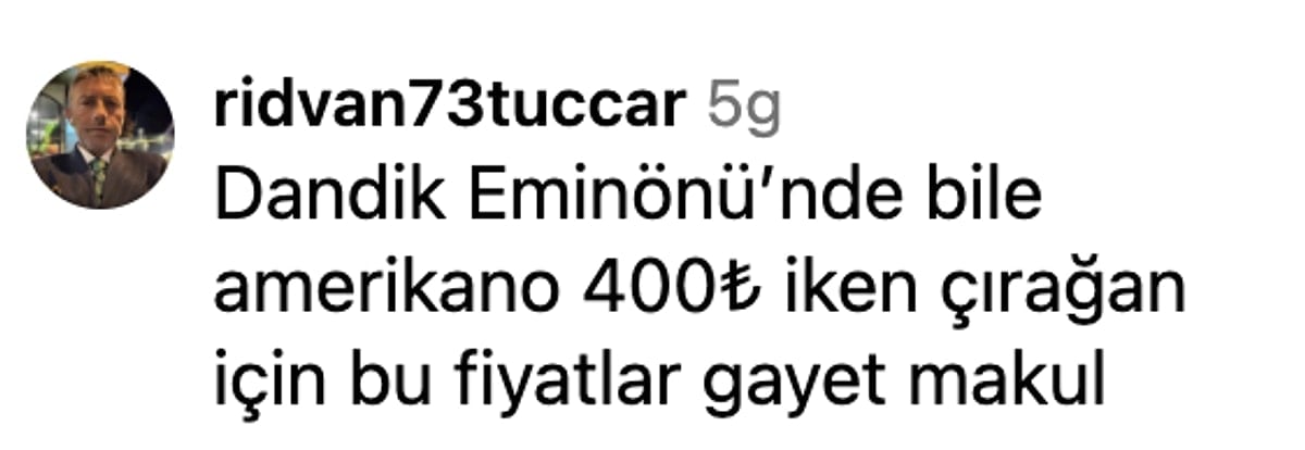 Söz konusu fiyatlara çok sayıda kullanıcı ‘Bu fiyatların neresi ortalama, çok pahalı’ yorumunda bulunurken, bazı kullanıcılar ise bu duruma ‘Dandik Eminönü’nde bile Americano 400 TL iken Çırağan için bu fiyatlar gayet makul’ sözleriyle itiraz etti.
