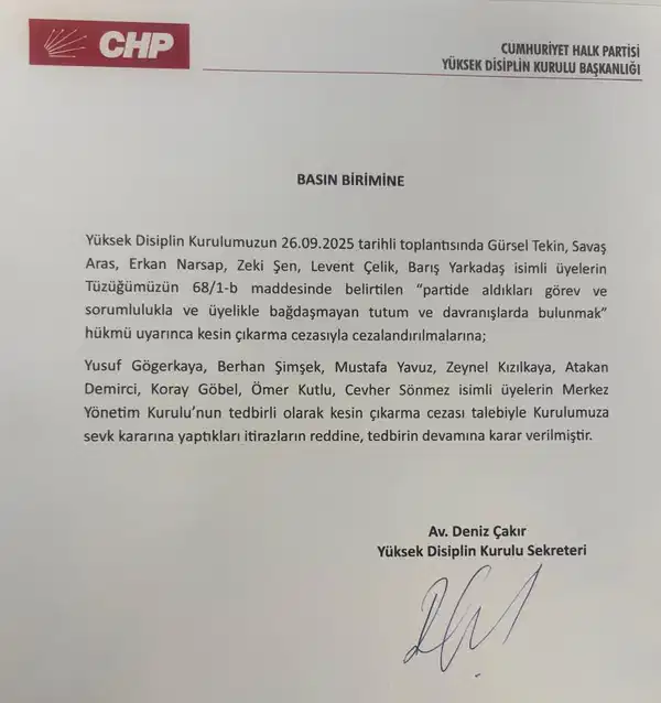 “Yüksek Disiplin Kurulumuzun 26.09.2025 tarihli toplantısında Gürsel Tekin, Savaş Aras, Erkan Narsap, Zeki Şen, Levent Çelik, Barış Yarkadaş isimli üyelerin Tüzüğümüzün 68/1-b maddesinde belirtilen “partide aldıkları görev ve sorumlulukla ve üyelikle bağdaşmayan tutum ve davranışlarda bulunmak” hükmü uyarınca kesin çıkarma cezasıyla cezalandırılmalarına;